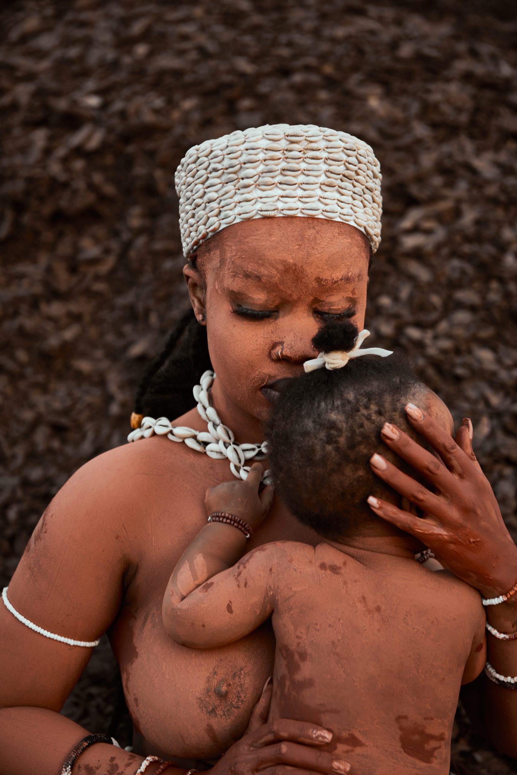 In the captivating photographic art piece titled “Inzalabantu”, the essence of motherhood and protection is masterfully captured. The image features a strong and radiant mother cradling her precious baby in her loving arms. Both figures are covered in “ubovu,” a clay that acts as a symbolic and protective barrier for their skin, much like the unwavering shelter of a mother’s embrace.